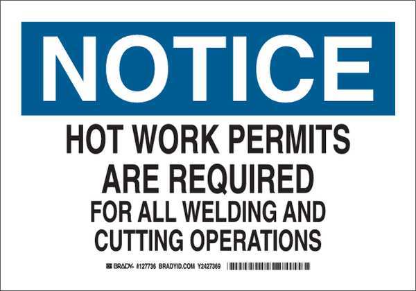 SKU G7364852Categories SafetyDescription Notice Sign, Sign Subject Matter Welding Hazard, Height 10 in, Width 14 in, Sign Material Aluminum, Sign Mounting Style With Mounting Holes, Header Notice, Legend Hot Work Permits are Required For All Welding And Cutting Operations, Printed Language English, Sign Shape Rectangle$32.11 / eachWeb priceNotice Sign, 10 in H, 14 in W, Aluminum, Rectangle, English, 127737SKU G7364852Categories SafetyDescription Notice Sign, Sign Subject Matter Welding Hazard, Height 10 in, Width 14 in, Sign Material Aluminum, Sign Mounting Style With Mounting Holes, Header Notice, Legend Hot Work Permits are Required For All Welding And Cutting Operations, Printed Language English, Sign Shape Rectangle$32.11 / eachWeb price -