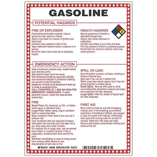 Chemical Sign, 10 in Height, 7 in Width, RectangleSKU G6223901Categories SafetyDescription Chemical Sign, Gasoline Potential Hazards, Fiberglass, Height 10 in, Width 7 in, Header No Header, Legend Style Symbol and Text, Language English, Mounting Style Surface, Thickness 0.1 in, Sign Shape Rectangle, Operating Temp. Range -40 Degrees to 194 Degrees F, Retroreflective Grade Not RetroreflectivegraingerSKU: 41F479, mscSKU: , zoro_no: G6223901, mongo_id: 65bbe6883aaddbd5a9037e4c