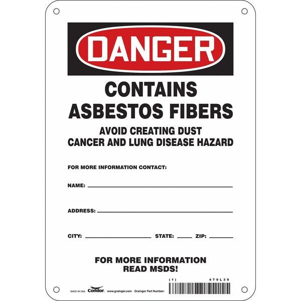 Safety Sign, 10 in Height, 7 in Width, Aluminum, Horizontal Rectangle, English, 479L39SKU G5789800Categories SafetyDescription Safety Sign, Horizontal Rectangle, Number of Printed Sides 1, English, Sign Format Traditional OSHA, Sign Legend Contains Asbestos Fibers Avoid Creating Dust Cancer And Lung Disease Hazard For More Information Contact: Name: _______ Address: _______ City: _______ State: _______ Zip: _______ For More Information Read Msds!, Sign Legend Background Color White, Sign Legend Style TextgraingerSKU: 479L39, mscSKU: , zoro_no: G5789800, mongo_id: 65bbe6753aaddbd5a902f5d2