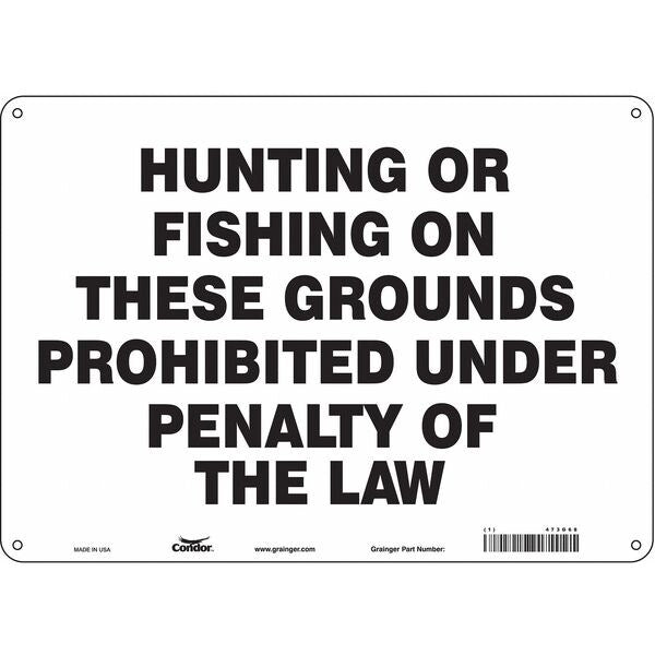 SKU G5573388Categories SafetyDescription Safety Sign, Horizontal Rectangle, Number of Printed Sides 1, English, Sign Format Other Format, Sign Legend Hunting Or Fishing On These Grounds Prohibited Under Penalty Of The Law, Sign Legend Background Color White, Sign Legend Style TextgraingerSKU: 473G68, mscSKU: , zoro_no: G5573388, mongo_id: 65bbe6753aaddbd5a902f3de