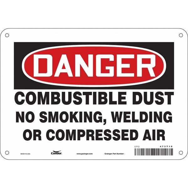 Safety Sign, 7" H, 10" W, Vertical Rectangle, English, 473T10SKU G5551067Categories SafetyDescription Safety Sign, Vertical Rectangle, Number of Printed Sides 1, English, Sign Format Traditional OSHA, Sign Legend Combustible Dust No Smoking, Welding Or Compressed Air, Sign Legend Background Color White, Sign Legend Style TextgraingerSKU: 473T10, mscSKU: , zoro_no: G5551067, mongo_id: 65bbe6753aaddbd5a902f662