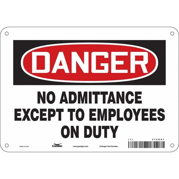 SKU G5561068Categories SafetyDescription Safety Sign, Vertical Rectangle, Number of Printed Sides 1, English, Sign Format Traditional OSHA, Sign Legend No Admittance Except To Employees On Duty, Sign Legend Background Color White, Sign Legend Style TextgraingerSKU: 472D07, mscSKU: , zoro_no: G5561068, mongo_id: 65bbe6753aaddbd5a902f63f