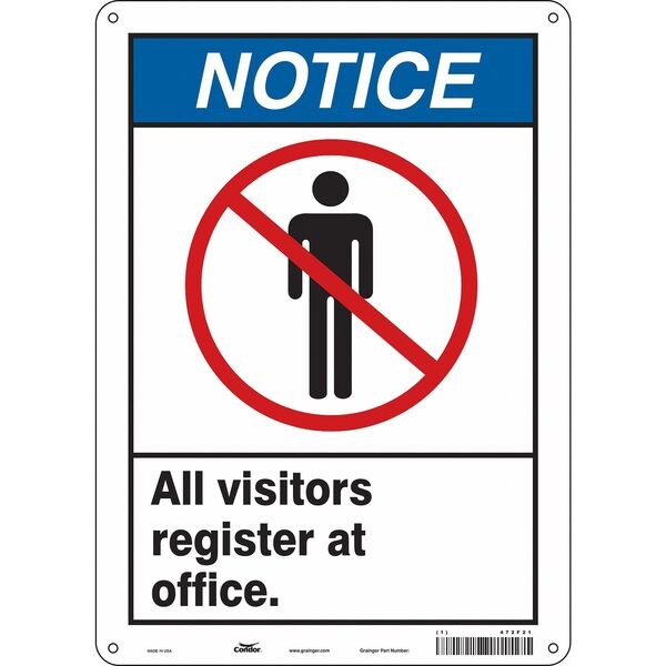 Safety Sign, 14 in Height, 10 in Width, Aluminum, Vertical Rectangle, English, 472F21SKU G5643099Categories SafetyDescription Safety Sign, Vertical Rectangle, Number of Printed Sides 1, English, Sign Legend All Visitors Register At Office., Sign Legend Background Color White, Sign Legend Style Symbol and TextgraingerSKU: 472F21, mscSKU: , zoro_no: G5643099, mongo_id: 65bbe6753aaddbd5a902f577