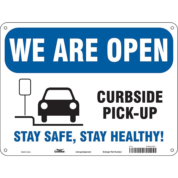 Safety Sign, 60GJ87SKU G1630784Categories SafetyDescription Safety Sign, Height 18 in, Width 24 in, Sign Material Plastic, Header We Are Open, Legend Curbside Pick-Up Stay Safe, Stay Healthy!, Printed Language EnglishgraingerSKU: , mscSKU: , zoro_no: G1630784, mongo_id: 65bbe6753aaddbd5a902f5c7