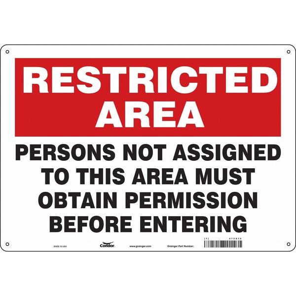 Safety Sign, 14 in H, 20 in W, Aluminum, Horizontal Rectangle, English, 472X10SKU G5232722Categories SafetyDescription Safety Sign, Horizontal Rectangle, Number of Printed Sides 1, English, Sign Format Other Format, Sign Legend Persons Not Assigned To This Area Must Obtain Permission Before Entering, Sign Legend Background Color Red, White, Sign Legend Style TextgraingerSKU: 472X10, mscSKU: , zoro_no: G5232722, mongo_id: 65bbe85f9a749db82278a005