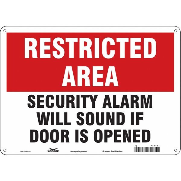 Safety Sign, 10 in Height, 14 in Width, Aluminum, Horizontal Rectangle, English, 473F34SKU G5581648Categories SafetyDescription Safety Sign, Horizontal Rectangle, Number of Printed Sides 1, English, Sign Format Other Format, Sign Legend Restricted Area Security Alarm Will Sound If Door Is Opened, Sign Legend Background Color Red, White, Sign Legend Style TextgraingerSKU: 473F34, mscSKU: , zoro_no: G5581648, mongo_id: 65bbe85f9a749db82278a00b