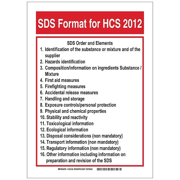 SKU G9685173Categories SafetyDescription SDS Sign, SDS Format SDS Order and Elements, Polyester, Height 14 in, Width 10 in, Header Sds Format For Hcs 2012, Language English, Sign Shape RectanglegraingerSKU: 31DJ67, mscSKU: , zoro_no: G9685173, mongo_id: 65bbe87122d7a989a98f68ef
