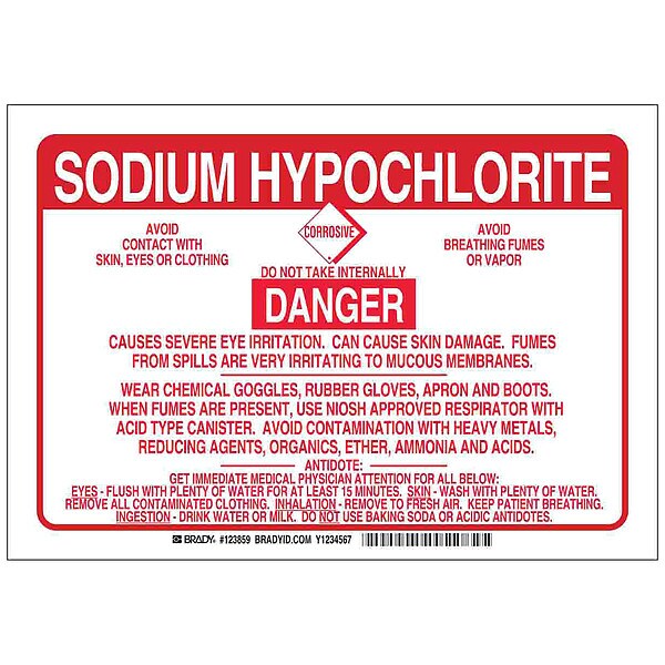 SKU G2634847Categories SafetyDescription Chemical Sign, Danger Avoid Contact With Skin, Eyes Or Clothing Corrosive Do Not Take Internally Avoid Breathing Fumes Or Vapor, Plastic, Height 10 in, Width 14 in, Header Sodium Hypochlorite, Legend Style Text, Language English, Mounting Style Surface, Thickness 0.06 in, Sign Shape Rectangle, Operating Temp. Range -40 Degrees to 176 Degrees F, Retroreflective Grade Not RetroreflectivegraingerSKU: 38J072, mscSKU: , zoro_no: G2634847, mongo_id: 65bbe87122d7a989a98f68f6