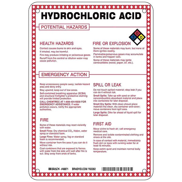 Chemical Sign, 10 in Height, 7 in Width, RectangleSKU G5540412Categories SafetyDescription Chemical Sign, Hydrochloric Acid Potential Hazards, Fiberglass, Height 10 in, Width 7 in, Header No Header, Legend Style Symbol and Text, Language English, Mounting Style Surface, Thickness 0.1 in, Sign Shape Rectangle, Operating Temp. Range -40 Degrees to 194 Degrees F, Retroreflective Grade Not RetroreflectivegraingerSKU: 41F482, mscSKU: , zoro_no: G5540412, mongo_id: 65bbe87122d7a989a98f6862