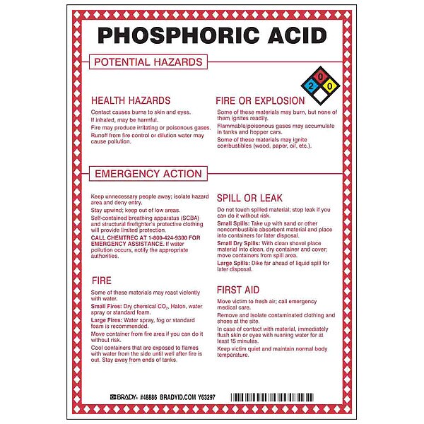 Chemical Sign, 10 in Height, 7 in Width, RectangleSKU G5622206Categories SafetyDescription Chemical Sign, Phosphoric Acid Potential Hazards, Fiberglass, Height 10 in, Width 7 in, Header No Header, Legend Style Symbol and Text, Language English, Mounting Style Surface, Thickness 0.1 in, Sign Shape Rectangle, Operating Temp. Range -40 Degrees to 194 Degrees F, Retroreflective Grade Not RetroreflectivegraingerSKU: 41F497, mscSKU: , zoro_no: G5622206, mongo_id: 65bbe89c22d7a989a9904db2