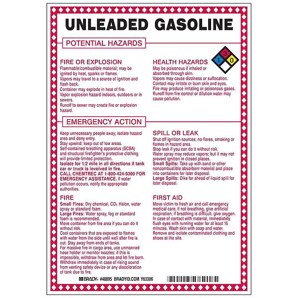 Chemical Sign, 10 in Height, 7 in Width, RectangleSKU G5537131Categories SafetyDescription Chemical Sign, Unleaded Gasoline Potential Hazards, Fiberglass, Height 10 in, Width 7 in, Header No Header, Legend Style Symbol and Text, Language English, Mounting Style Surface, Thickness 0.1 in, Sign Shape Rectangle, Operating Temp. Range -40 Degrees to 194 Degrees F, Retroreflective Grade Not RetroreflectivegraingerSKU: 41F507, mscSKU: , zoro_no: G5537131, mongo_id: 65bbe87122d7a989a98f686b