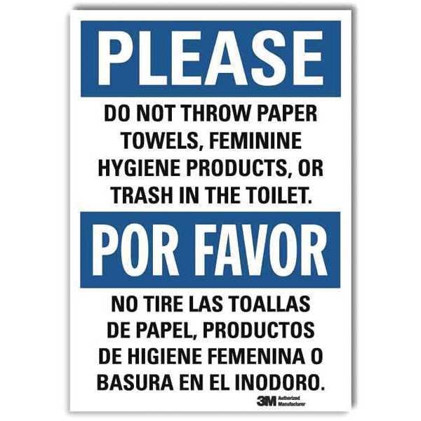 Hygiene Sign, 14x10 In., Bilingual, U1-1049-RD_10X14SKU G1817630Categories SafetyDescription Hygiene Sign, Vertical Rectangle, Number of Printed Sides 1, English, Spanish, Sign Legend Do Not Throw Paper Towels, Feminine Hygiene Products, Or Trash In The Toilet./No Tire Las Toallas De Papel, Productos De Hygiene Feminine O Basura En El Inodoro., Sign Legend Background Color White, Sign Legend Style TextgraingerSKU: 24WX38, mscSKU: , zoro_no: G1817630, mongo_id: 65bbe85f9a749db822789c4d