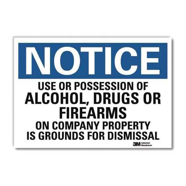 Notice Sign, 5 in H, 7 in W, Reflective Sheeting, Horizontal Rectangle, English, U5-1595-RD_7X5SKU G2756349Categories SafetyDescription Notice Sign, Horizontal Rectangle, Number of Printed Sides 1, English, Sign Format Traditional OSHA, Sign Legend Use Or Possession Of Alcohol, Drugs Or Firearms On Company Property Is Grounds For Dismissal, Sign Legend Background Color White, Sign Legend Style TextgraingerSKU: 34JY73, mscSKU: , zoro_no: G2756349, mongo_id: 65bbe85f9a749db822789c75