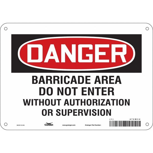 Safety Sign, 7 in Height, 10 in Width, Aluminum, Vertical Rectangle, English, 472M34SKU G5546298Categories SafetyDescription Safety Sign, Vertical Rectangle, Number of Printed Sides 1, English, Sign Format Traditional OSHA, Sign Legend Barricade Area Do Not Enter Without Authorization Or Supervision, Sign Legend Background Color White, Sign Legend Style TextgraingerSKU: 472M34, mscSKU: , zoro_no: G5546298, mongo_id: 65bbe85f22d7a989a98ee08a