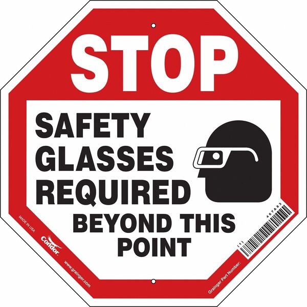 SKU G5071917Categories SafetyDescription Safety Sign, Octagon, Number of Printed Sides 1, English, Sign Format Other Format, Sign Legend Stop Safety Glasses Required Beyond This Point, Sign Legend Background Color Red, White, Sign Legend Style Symbol and TextgraingerSKU: 467A83, mscSKU: , zoro_no: G5071917, mongo_id: 65bbe85f22d7a989a98ee0c7