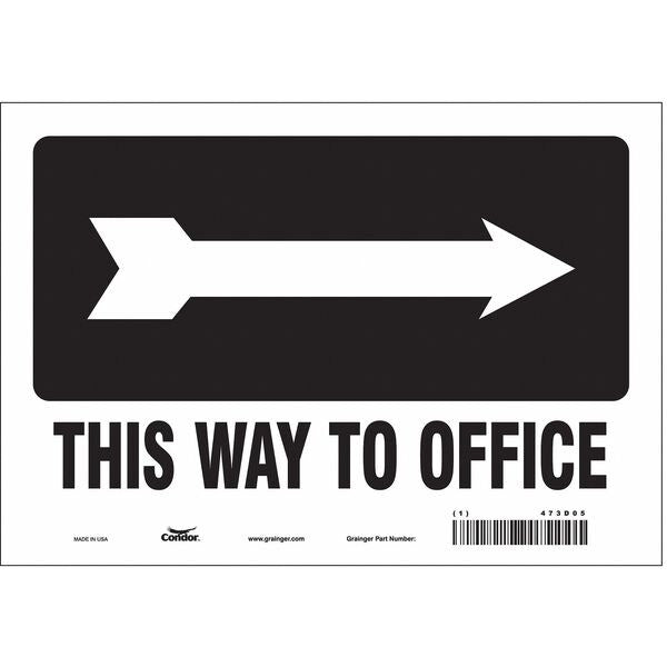 SKU G5510762Categories SafetyDescription Safety Sign, Vertical Rectangle, Number of Printed Sides 1, English, Sign Format Other Format, Sign Legend This Way To Office (Right Arrow), Sign Legend Background Color White, Sign Legend Style Symbol and TextgraingerSKU: 473D05, mscSKU: , zoro_no: G5510762, mongo_id: 65bbe85f22d7a989a98ee08f