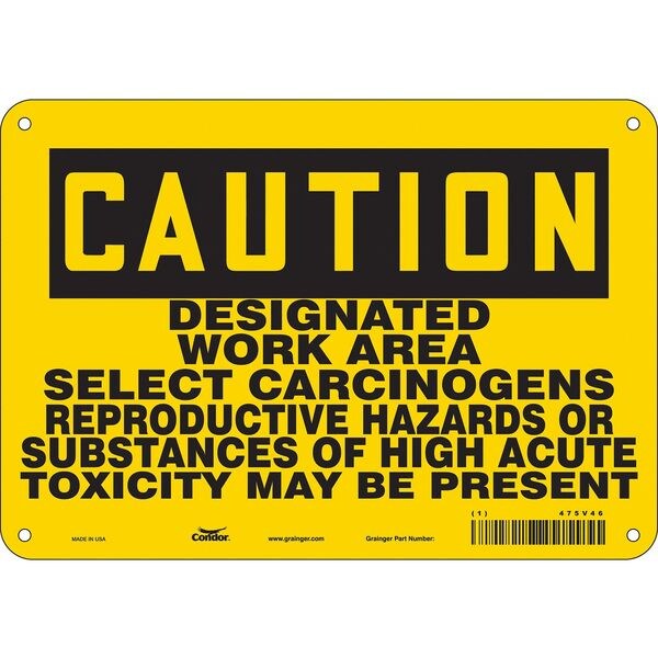 Safety Sign, 7 in Height, 10 in Width, Aluminum, Vertical Rectangle, English, 475V46SKU G5885798Categories SafetyDescription Safety Sign, Vertical Rectangle, Number of Printed Sides 1, English, Sign Format Traditional OSHA, Sign Legend Designated Work Area Select Carcinogens Reproductive Hazards Or Substances Of High Acute Toxicity May Be Present, Sign Legend Background Color Yellow, Sign Legend Style TextgraingerSKU: 475V46, mscSKU: , zoro_no: G5885798, mongo_id: 65bbe85f22d7a989a98ee094