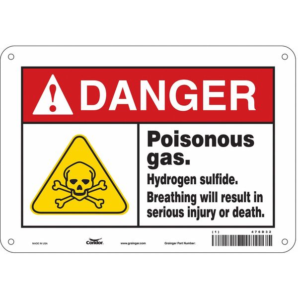 Safety Sign, 7 in Height, 10 in Width, Aluminum, Vertical Rectangle, English, 476D32SKU G5859767Categories SafetyDescription Safety Sign, Vertical Rectangle, Number of Printed Sides 1, English, Sign Format ANSI/OSHA Format, Sign Legend Poisonous Gas. Hydrogen Sulfide. Breathing Will Result In Serious Injury Or Death., Sign Legend Background Color White, Sign Legend Style Symbol and TextgraingerSKU: 476D32, mscSKU: , zoro_no: G5859767, mongo_id: 65bbe8069a749db82276d555