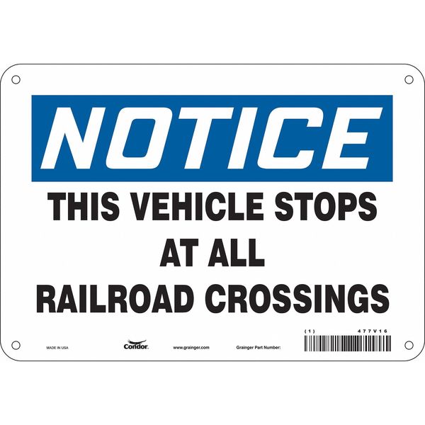 $18.74 / eachWeb priceTraffic Sign, 7 in H, 10 in W, Aluminum, Vertical Rectangle, English, 477V16SKU G5872489Categories SafetyDescription Traffic Sign, Vertical Rectangle, Number of Printed Sides 1, English, Sign Format Traditional OSHA, Sign Legend This Vehicle Stops At All Railroad Crossings, Sign Legend Background Color White, Sign Legend Style TextgraingerSKU: 477V16, mscSKU: , zoro_no: G5872489, mongo_id: 65bbe7da9a749db82275f079
