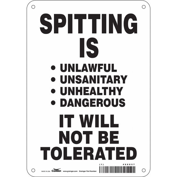 SKU G5360183Categories SafetyDescription Safety Sign, Horizontal Rectangle, Number of Printed Sides 1, English, Sign Legend Spitting Is Unlawful Unsanitary Unhealthy Dangerous It Will Not Be Tolerated, Sign Legend Background Color White, Sign Legend Style TextgraingerSKU: 468X57, mscSKU: , zoro_no: G5360183, mongo_id: 65bbe7da9a749db82275eeec