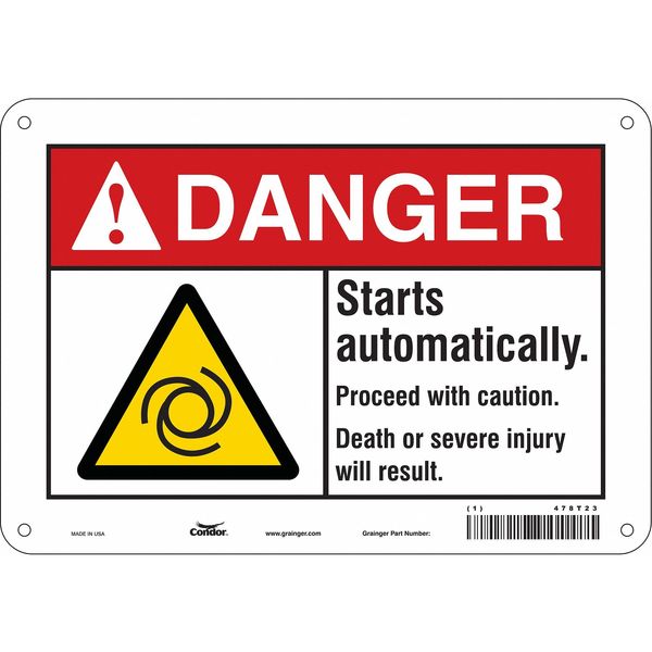 $18.74 / eachWeb priceSafety Sign, 7 in Height, 10 in Width, Aluminum, Vertical Rectangle, English, 478T23SKU G5871859Categories SafetyDescription Safety Sign, Vertical Rectangle, Number of Printed Sides 1, English, Sign Format ANSI/OSHA Format, Sign Legend Starts Automatically. Proceed With Caution. Death Or Severe Injury Will Result., Sign Legend Background Color White, Sign Legend Style Symbol and TextgraingerSKU: 478T23, mscSKU: , zoro_no: G5871859, mongo_id: 65bbe7da9a749db82275f0aa