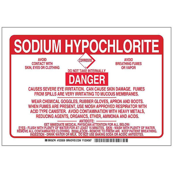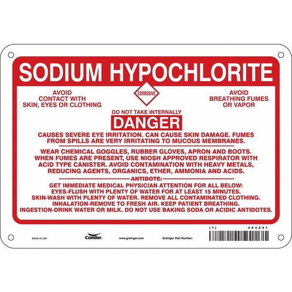 SKU G6223831Categories SafetyDescription Chemical Sign, Danger Avoid Contact With Skin, Eyes Or Clothing Corrosive Do Not Take Internally Avoid Breathing Fumes Or Vapor, Polyester, Height 10 in, Width 14 in, Header Sodium Hypochlorite, Legend Style Text, Language English, Mounting Style Surface, Thickness 0.006 in, Sign Shape Rectangle, Operating Temp. Range -40 Degrees to 230 Degrees F, Retroreflective Grade Not RetroreflectivegraingerSKU: 38J073, mscSKU: , zoro_no: G6223831, mongo_id: 65bbe8219a749db822775e02