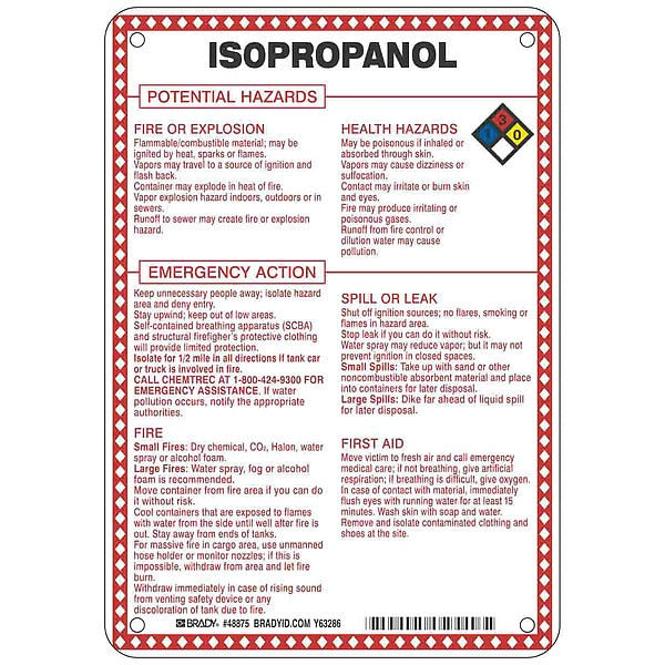 SKU G5576234Categories SafetyDescription Chemical Sign, Isopropanol Potential Hazards, Fiberglass, Height 10 in, Width 7 in, Header No Header, Legend Style Symbol and Text, Language English, Mounting Style Surface, Thickness 0.1 in, Sign Shape Rectangle, Operating Temp. Range -40 Degrees to 194 Degrees F, Retroreflective Grade Not RetroreflectivegraingerSKU: 41F486, mscSKU: , zoro_no: G5576234, mongo_id: 65bbe8219a749db822775d5d