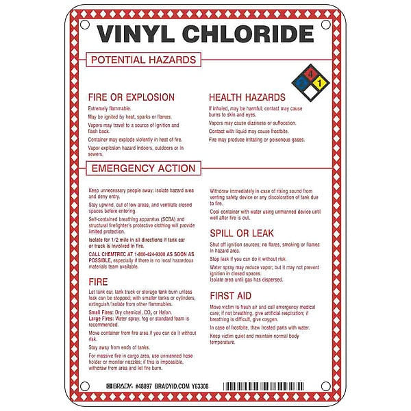 Chemical Sign, 10 in Height, 7 in Width, RectangleSKU G5482556Categories SafetyDescription Chemical Sign, Vinyl Chloride Potential Hazards, Fiberglass, Height 10 in, Width 7 in, Header No Header, Legend Style Symbol and Text, Language English, Mounting Style Surface, Thickness 0.1 in, Sign Shape Rectangle, Operating Temp. Range -40 Degrees to 194 Degrees F, Retroreflective Grade Not RetroreflectivegraingerSKU: 41F509, mscSKU: , zoro_no: G5482556, mongo_id: 65bbe8219a749db822775dd7