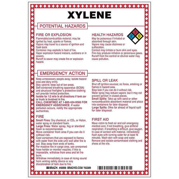 Chemical Sign, 10 in Height, 7 in Width, RectangleSKU G5823711Categories SafetyDescription Chemical Sign, Xylene Potential Hazards, Fiberglass, Height 10 in, Width 7 in, Header No Header, Legend Style Symbol and Text, Language English, Mounting Style Surface, Thickness 0.1 in, Sign Shape Rectangle, Operating Temp. Range -40 Degrees to 194 Degrees F, Retroreflective Grade Not RetroreflectivegraingerSKU: 41F510, mscSKU: , zoro_no: G5823711, mongo_id: 65bbe8219a749db822775e9d