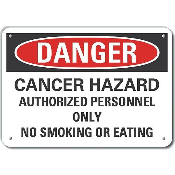 SKU G9498496Categories SafetyDescription Plastic Cancer Hazard Danger Sign, Horizontal Rectangle, Number of Printed Sides 1, English, Sign Format Traditional OSHA, Sign Legend Cancer Hazard Authorized Personnel Only No Smoking Or Eating, Sign Legend Background Color White, Sign Legend Style Text$7.44 / eachWeb price