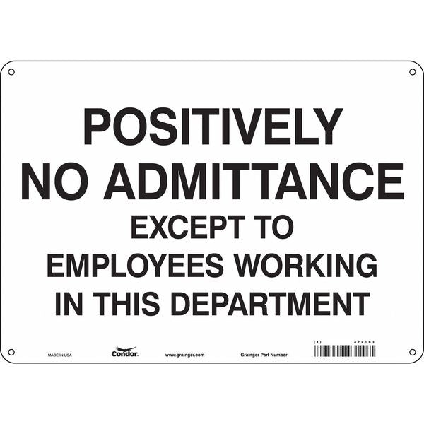 Safety Sign, 10 in Height, 14 in Width, Aluminum, Horizontal Rectangle, English, 472C63SKU G5171770Categories SafetyDescription Safety Sign, Horizontal Rectangle, Number of Printed Sides 1, English, Sign Format Other Format, Sign Legend Positively No Admittance Except To Employees Working In This Department, Sign Legend Background Color White, Sign Legend Style TextgraingerSKU: 472C63, mscSKU: , zoro_no: G5171770, mongo_id: 65bbe8069a749db82276d47d