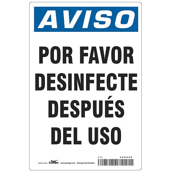 SKU G8513907Categories SafetyDescription Spanish Por Favor Desinfecte Sign, Sign Subject Matter Coronavirus Prevention, Height 10 in, Width 7 in, Sign Material Polystyrene, Sign Mounting Style With Mounting Holes, Header Aviso, Legend Por Favor Desinfecte DespuÃ(C)s Del Uso, Printed Language Spanish, Sign Shape Rectangle$7.06 / eachWeb price
