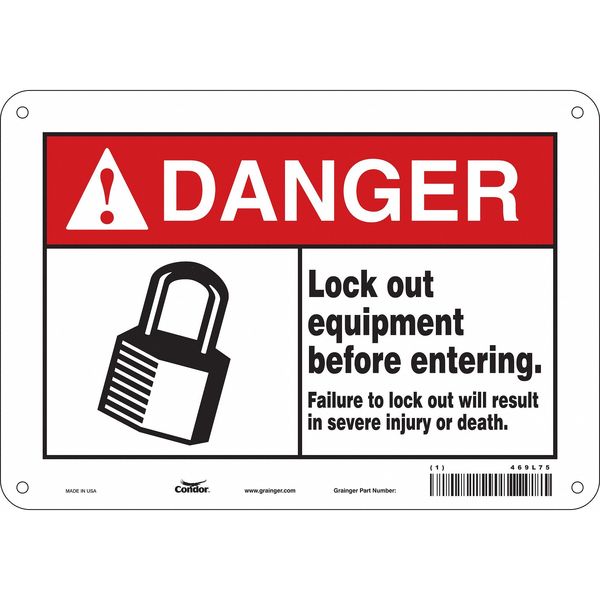 Safety Sign, 7 in Height, 10 in Width, Aluminum, Vertical Rectangle, English, 469L75SKU G5093422Categories SafetyDescription Safety Sign, Vertical Rectangle, Number of Printed Sides 1, English, Sign Format ANSI/OSHA Format, Sign Legend Lock Out Equipment Before Entering. Failure To Lock Out Will Result In Severe Injury Or Death., Sign Legend Background Color White, Sign Legend Style Symbol and TextgraingerSKU: 469L75, mscSKU: , zoro_no: G5093422, mongo_id: 65bbe8069a749db82276d4fc