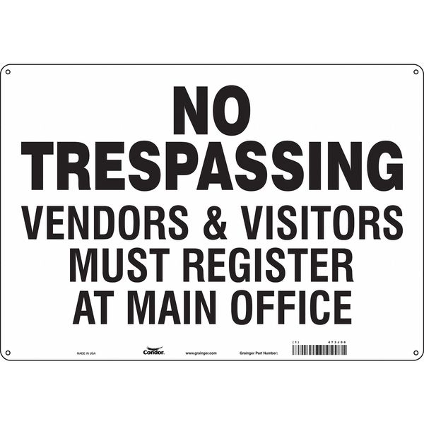 SKU G5566430Categories SafetyDescription Safety Sign, Horizontal Rectangle, Number of Printed Sides 1, English, Sign Format Other Format, Sign Legend No Trespassing Vendors & Visitors Must Register At Main Office, Sign Legend Background Color White, Sign Legend Style TextgraingerSKU: 473J06, mscSKU: , zoro_no: G5566430, mongo_id: 65bbe8069a749db82276d43c