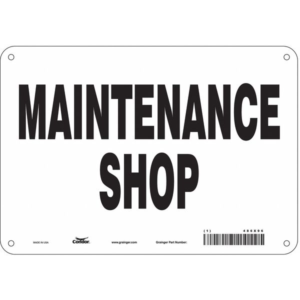 Safety Sign, 7 in Height, 10 in Width, Aluminum, Vertical Rectangle, English, 486X96SKU G6309867Categories SafetyDescription Safety Sign, Vertical Rectangle, Number of Printed Sides 1, English, Sign Legend Maintenance Shop, Sign Legend Background Color White, Sign Legend Style TextgraingerSKU: 486X96, mscSKU: , zoro_no: G6309867, mongo_id: 65bbe8069a749db82276d404