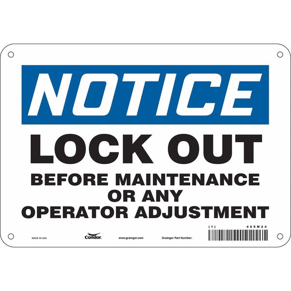 Safety Sign, 7 in Height, 10 in Width, Aluminum, Vertical Rectangle, English, 469M24SKU G5385429Categories SafetyDescription Safety Sign, Vertical Rectangle, Number of Printed Sides 1, English, Sign Format Traditional OSHA, Sign Legend Lock Out Before Maintenance Or Any Operator Adjustment, Sign Legend Background Color White, Sign Legend Style TextgraingerSKU: 469M24, mscSKU: , zoro_no: G5385429, mongo_id: 65bbe8069a749db82276d352