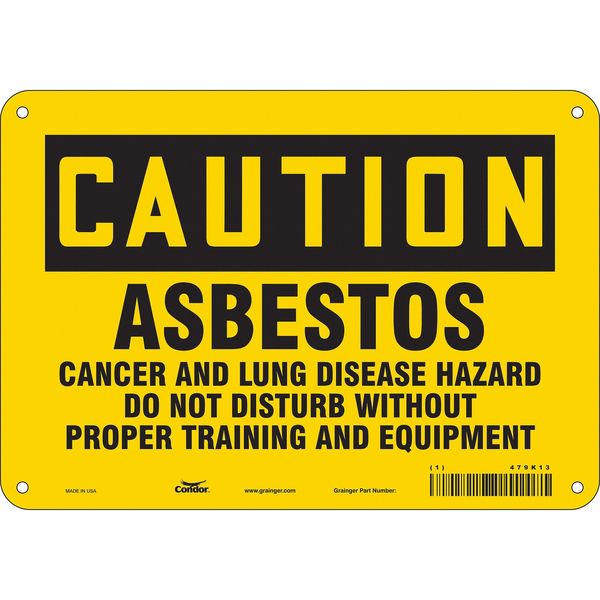Safety Sign, 7 in Height, 10 in Width, Aluminum, Vertical Rectangle, English, 479K13SKU G5866292Categories SafetyDescription Safety Sign, Vertical Rectangle, Number of Printed Sides 1, English, Sign Format Traditional OSHA, Sign Legend Asbestos Cancer And Lung Disease Hazard Do Not Disturb Without Proper Training And Equipment, Sign Legend Background Color Yellow, Sign Legend Style TextgraingerSKU: 479K13, mscSKU: , zoro_no: G5866292, mongo_id: 65bbe8069a749db82276d37d
