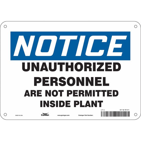 SKU G5256863Categories SafetyDescription Safety Sign, Vertical Rectangle, Number of Printed Sides 1, English, Sign Format Traditional OSHA, Sign Legend Unauthorized Personnel Are Not Permitted Inside Plant, Sign Legend Background Color White, Sign Legend Style TextgraingerSKU: 472V91, mscSKU: , zoro_no: G5256863, mongo_id: 65bbe8069a749db82276d478