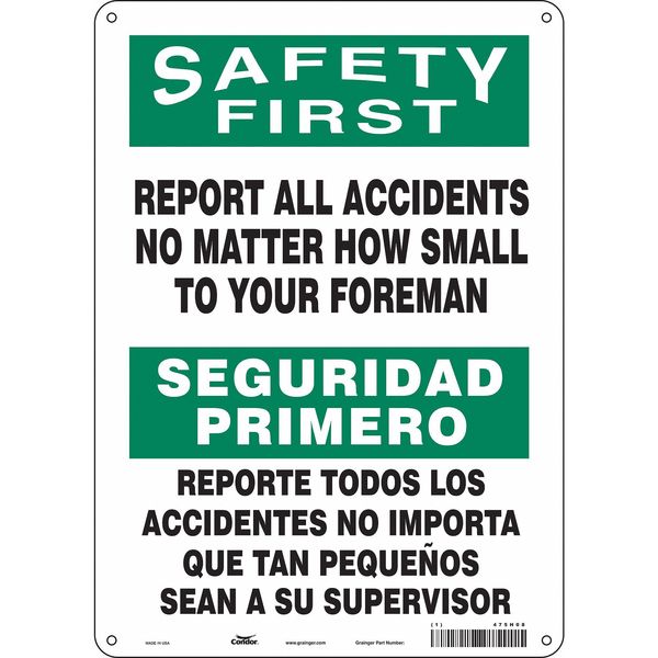 SKU G5629388Categories SafetyDescription Safety Sign, Vertical Rectangle, Number of Printed Sides 1, English, Spanish, Sign Format Traditional OSHA, Sign Legend Report All Accidents No Matter How Small To Your Foreman/Reporte Todos Los Accidentes No Importa Que Tan Pequenos Sean A Su Supervisor, Sign Legend Background Color White, Sign Legend Style TextgraingerSKU: 475H08, mscSKU: , zoro_no: G5629388, mongo_id: 65bbe80722d7a989a98d13c3