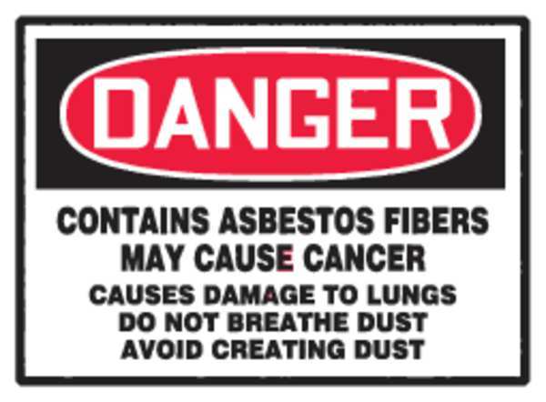 SKU G0701185Categories SafetyDescription Safety Label, Horizontal Rectangle, Number of Printed Sides 1, English, Sign Format Traditional OSHA, Sign Legend Contains Asbestos Fibers May Cause Cancer Causes Damage To Lungs Do Not Breathe Dust Avoid Creating Dust, Sign Legend Background Color White, Sign Legend Style TextgraingerSKU: 45DL45, mscSKU: , zoro_no: G0701185, mongo_id: 65bbe76d3aaddbd5a9093c26