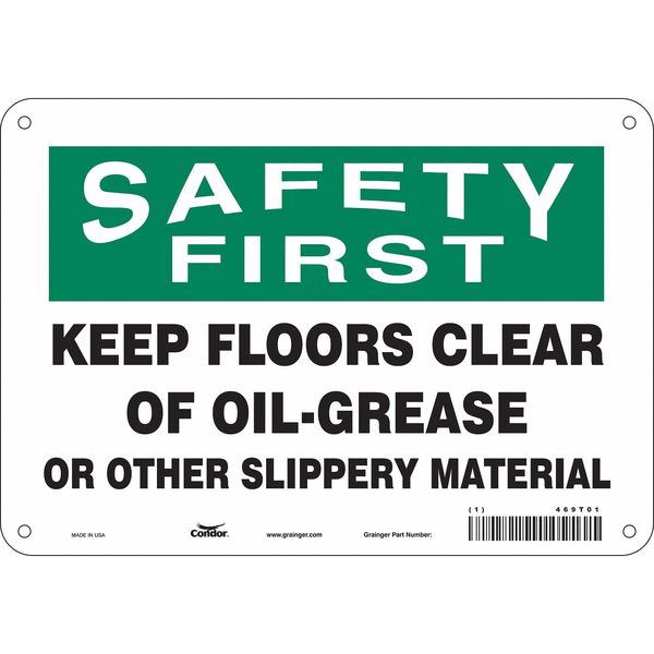Safety Sign, 7 in Height, 10 in Width, Aluminum, Vertical Rectangle, English, 469T01SKU G5296407Categories SafetyDescription Safety Sign, Vertical Rectangle, Number of Printed Sides 1, English, Sign Format Traditional OSHA, Sign Legend Keep Floors Clear Of Oil-Grease Or Other Slippery Material, Sign Legend Background Color White, Sign Legend Style TextgraingerSKU: 469T01, mscSKU: , zoro_no: G5296407, mongo_id: 65bbe76d3aaddbd5a90939c8