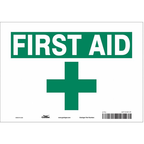 First Aid Sign, 10" W x 7" H, 0.004" Thick, 471V17SKU G5093851Categories SafetyDescription First Aid Sign, Vertical Rectangle, Number of Printed Sides 1, English, Sign Legend First Aid, Sign Legend Background Color Green, White, Sign Legend Style Symbol and TextgraingerSKU: 471V17, mscSKU: , zoro_no: G5093851, mongo_id: 65bbe76d3aaddbd5a9093a1a