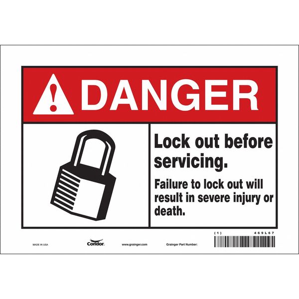 Safety Sign, 7 in Height, 10 in Width, Vinyl, Vertical Rectangle, English, 469L67SKU G5093459Categories SafetyDescription Safety Sign, Vertical Rectangle, Number of Printed Sides 1, English, Sign Format ANSI/OSHA Format, Sign Legend Lock Out Before Servicing. Failure To Lock Out Will Result In Severe Injury Or Death., Sign Legend Background Color White, Sign Legend Style Symbol and TextgraingerSKU: 469L67, mscSKU: , zoro_no: G5093459, mongo_id: 65bbe76d3aaddbd5a909392b