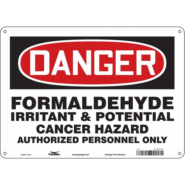 SKU G5834110Categories SafetyDescription Safety Sign, Horizontal Rectangle, Number of Printed Sides 1, English, Sign Format Traditional OSHA, Sign Legend Formaldehyde Irritant & Potential Cancer Hazard Authorized Personnel Only, Sign Legend Background Color White, Sign Legend Style TextgraingerSKU: 475V84, mscSKU: , zoro_no: G5834110, mongo_id: 65bbe76d3aaddbd5a9093967
