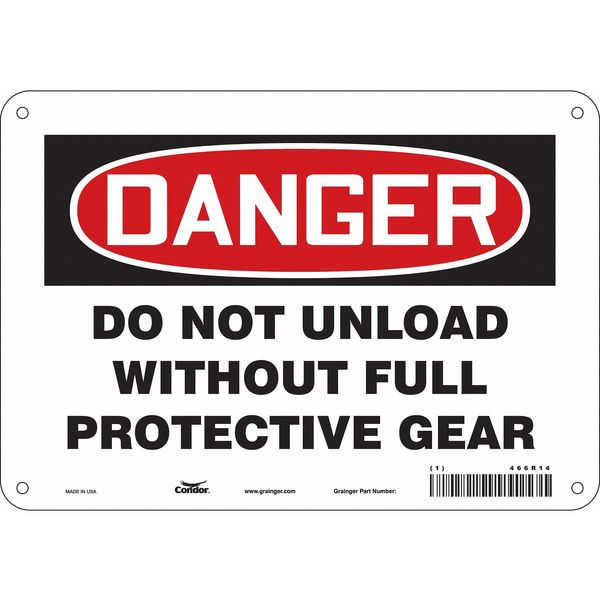 SKU G5638381Categories SafetyDescription Safety Sign, Vertical Rectangle, Number of Printed Sides 1, English, Sign Format Traditional OSHA, Sign Legend Do Not Unload Without Full Protective Gear, Sign Legend Background Color White, Sign Legend Style TextgraingerSKU: 466R14, mscSKU: , zoro_no: G5638381, mongo_id: 65bbe76c3aaddbd5a90937e3