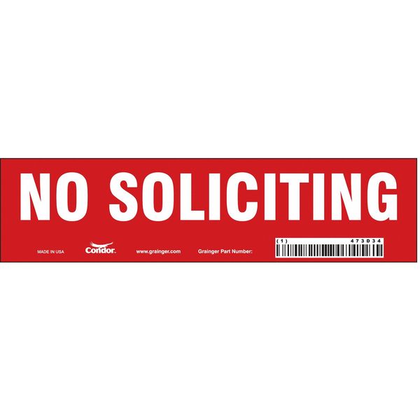 Safety Sign, 2 in Height, 8 in Width, Vinyl, Horizontal Rectangle, EnglishSKU G5638311Categories SafetyDescription Safety Sign, Horizontal Rectangle, Number of Printed Sides 1, English, Sign Format Other Format, Sign Legend No Soliciting, Sign Legend Background Color Red, Sign Legend Style TextgraingerSKU: 473D34, mscSKU: , zoro_no: G5638311, mongo_id: 65bbe76c3aaddbd5a90937f2