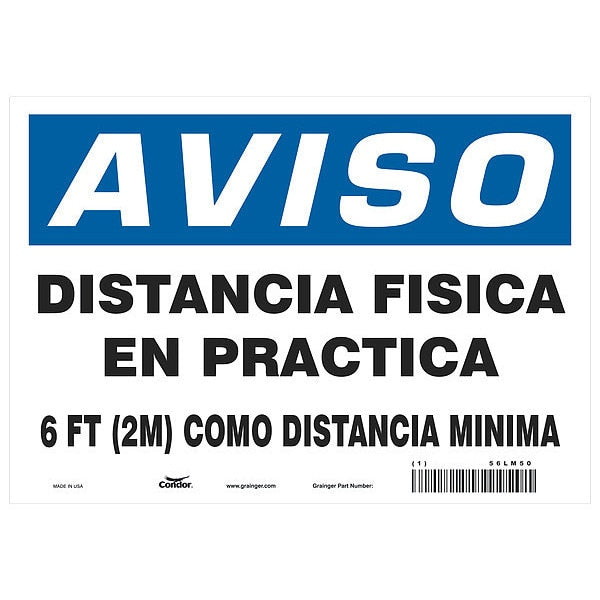 Covid 19 Sign 7X10, Spanish Notice Physi, 7 in Height, 10 in Width, Polystyrene, SpanishSKU G7660494Categories SafetyDescription Covid 19 Sign 7X10, Spanish Notice Physi, Sign Subject Matter Coronavirus Prevention, Height 7 in, Width 10 in, Sign Material Polystyrene, Sign Mounting Style With Mounting Holes, Header Aviso, Legend Distancia Fisica En Practica; 6ft (2m) Como Distancia Minima, Printed Language Spanish$7.06 / eachWeb price -