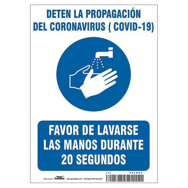 Covid 19 Sign 10X14, Spanish Prevent Cov, 10 in Height, 14 in Width, Polyester, SpanishSKU G7661228Categories SafetyDescription Covid 19 Sign 10X14, Spanish Prevent Cov, Sign Subject Matter Coronavirus Prevention, Height 10 in, Width 14 in, Sign Material Polyester, Sign Mounting Style Adhesive Surface, Header No Header, Legend Deten El Propagación Del Coronavirus (COVID-19); Favor De Lavarse Las Manos Durante 20 Segundos, Printed Language Spanish$9.94 / eachWeb price -