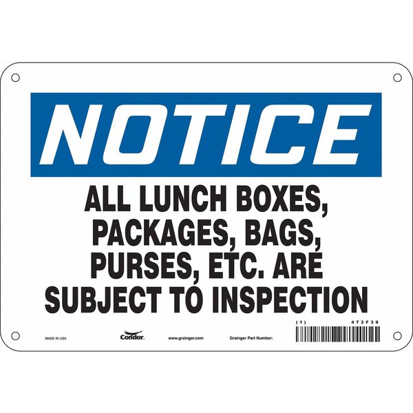 Safety Sign, 7 in Height, 10 in Width, Aluminum, Vertical Rectangle, English, 473F39SKU G5615333Categories SafetyDescription Safety Sign, Vertical Rectangle, Number of Printed Sides 1, English, Sign Format Traditional OSHA, Sign Legend All Lunch Boxes, Packages, Bags, Purses, Etc. Are Subject To Inspection, Sign Legend Background Color White, Sign Legend Style TextgraingerSKU: 473F39, mscSKU: , zoro_no: G5615333, mongo_id: 65bbe76d3aaddbd5a9093948