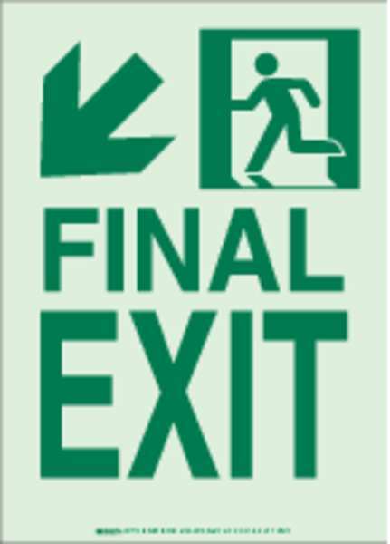 Exit Sign, 14X10", GRN/WHT, Final ExitSKU G7431048Categories SafetyDescription Exit Sign, Sign Subject Matter Exit and Entrance, Height 14 In., Width 10 In., Sign Material Polyester, Sign Mounting Style Adhesive Surface, Header No Header, Legend Final Exit, Printed Language English, Sign Shape Rectangle$32.11 / eachWeb price -